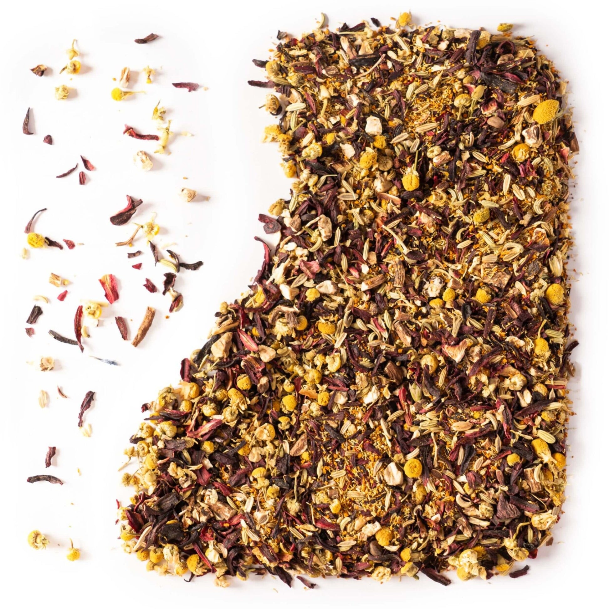 SKŁADNIKI: kwiat hibiskusa — 30%, korzeń mniszka lekarskiego — 27%, owoc kopru włoskiego — 20%, koszyczek rumianku — 18%, kłącze kurkumy — 5%.